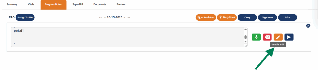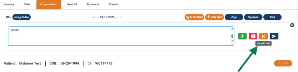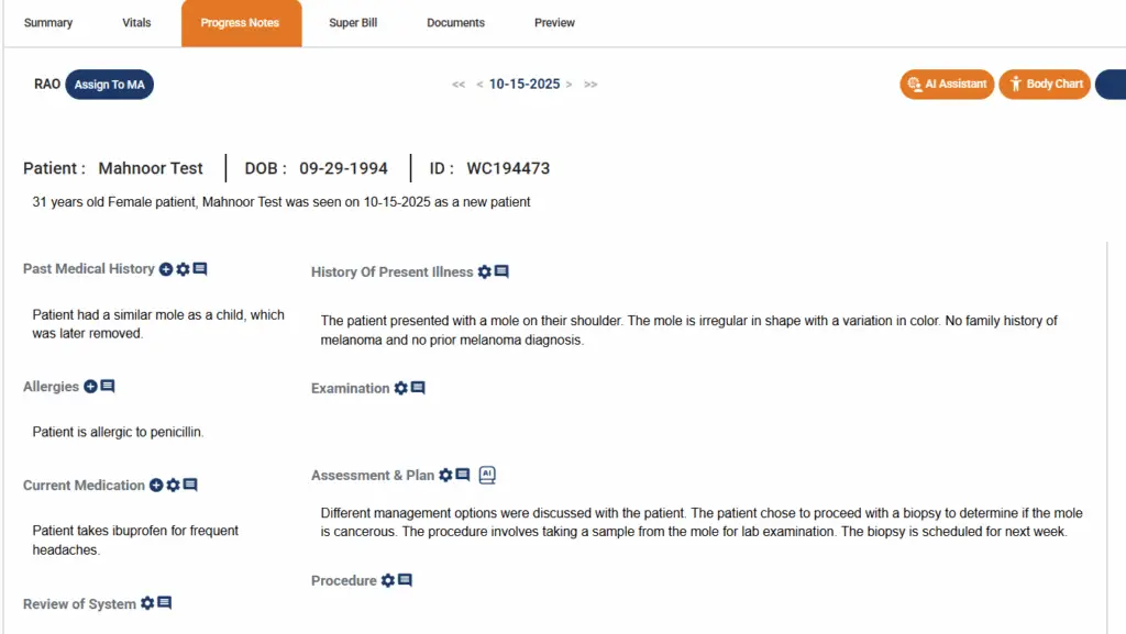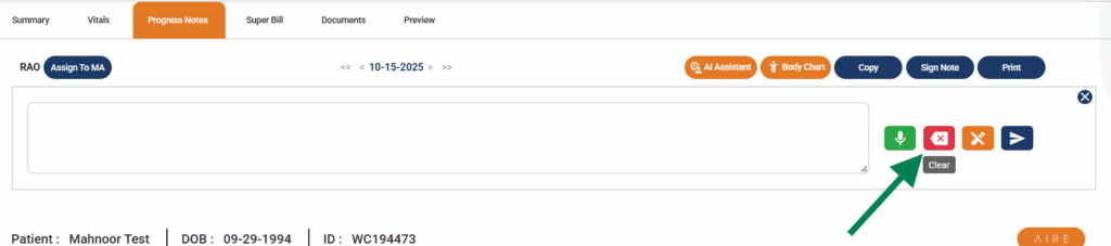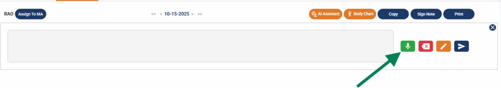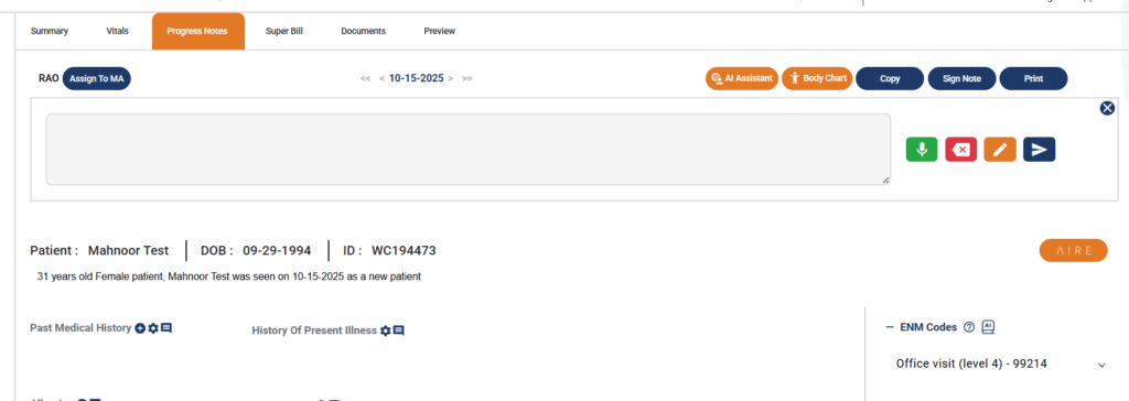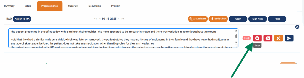 In a few seconds, you’ll be redirected to the progress note chart where you’ll be able to see the data AI has populated based on your speech input