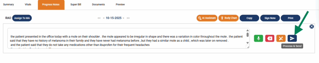 - Once you are finished conversing with the patient or dictating to AI, click the Process and Send button